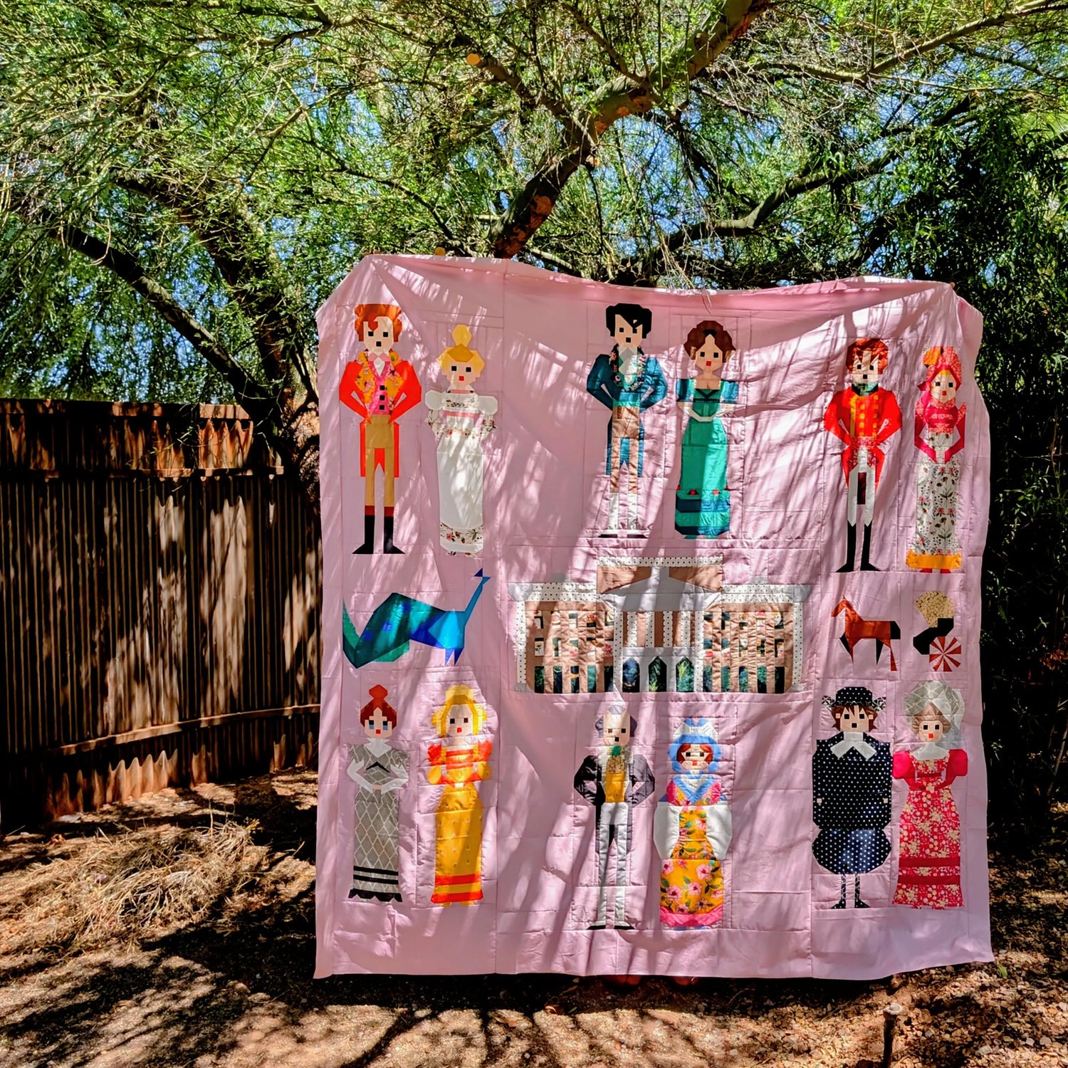 Quilt block patterns featuring characters from Jane Austen's Pride and Prejudice. Pick...