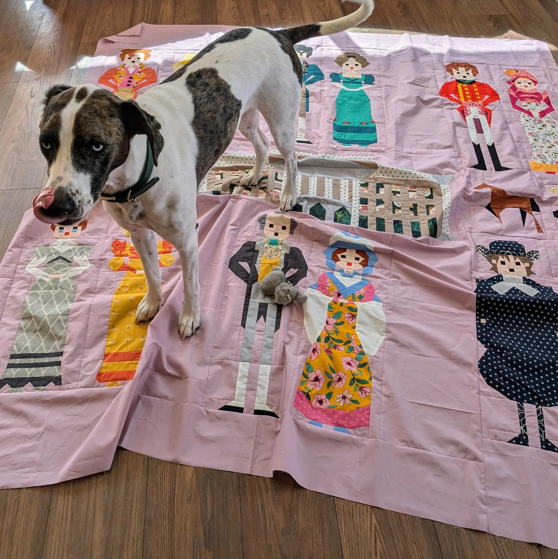 his bundle contains all of the PDFs to complete a Pride and Prejudiced quilt top measuring 76.5 x 80.5. I call it a throw, but it's a large one!