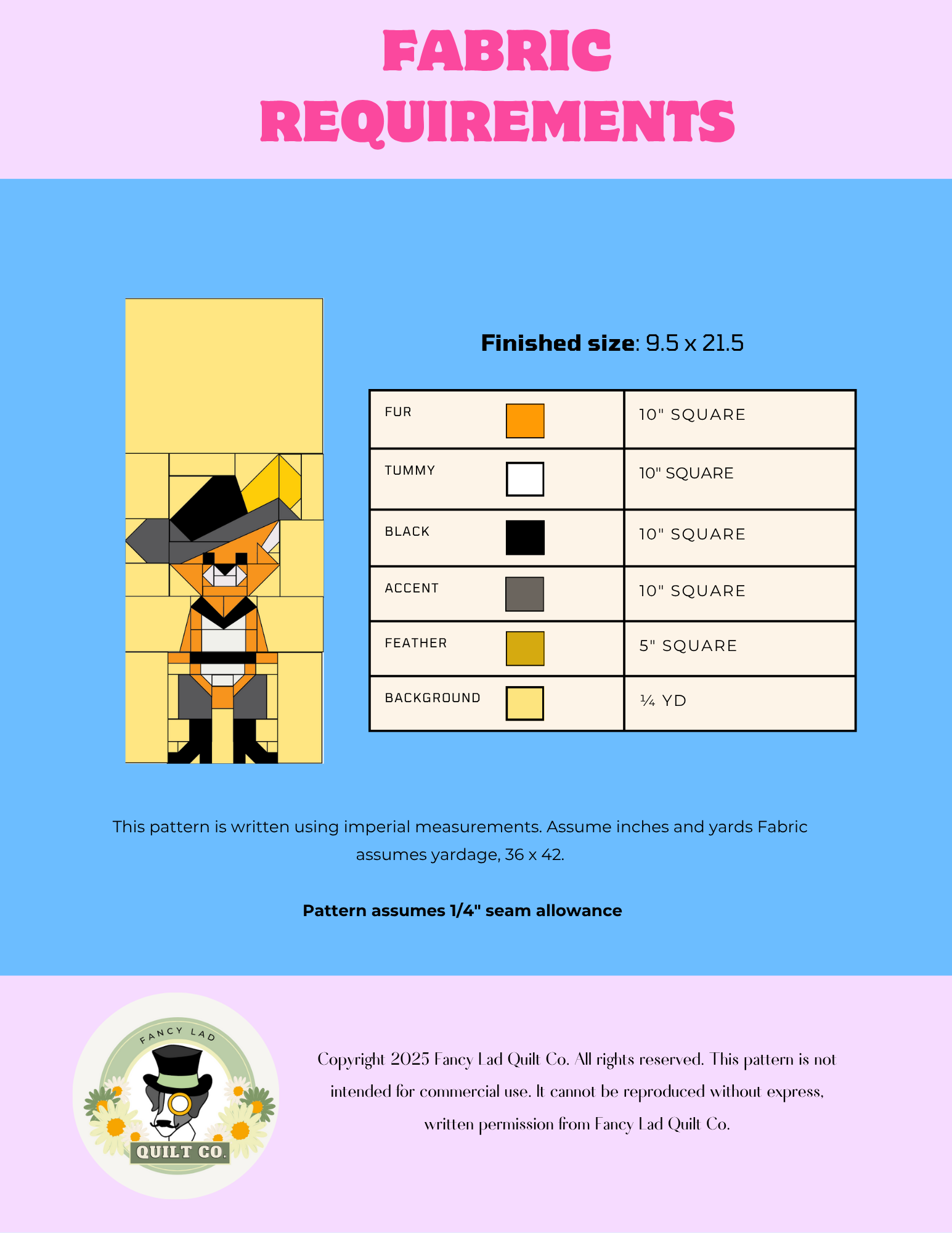 Kitty in Shoes is part of the Y2K sew-a-long. The pattern provides directions to make a 9.5 x 21.5 block. Pattern uses traditional piecing, and experience is recommended with stitch and flips, half triangle rectangles, small piecing, and point matching. Given techniques involved, an intermediate skill set is recommended. A confident beginner can attempt the block, but may have trouble with some techniques.