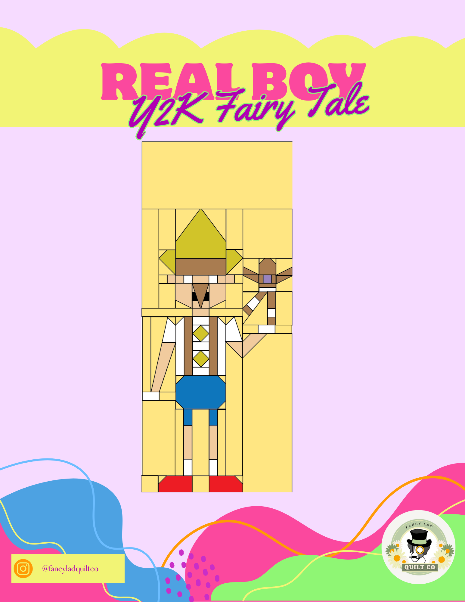 The Real Boy is part of the Y2K sew-a-long. The pattern provides directions to make a 9.5 x 21.5 block. Pattern uses traditional piecing, and experience is recommended with stitch and flips, half triangle rectangles, small piecing, and point matching. Given techniques involved, an intermediate skill set is recommended. A confident beginner can attempt the block, but may have trouble with some techniques.